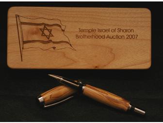 Handcrafted olivewood rollerball pen by Ron Czik. Body is hand turned from a solid piece of Israeli olivewood with a hand rubbed matte finish. Metal fittings are plated in titanium and will last for many years. Accepts standard rollerball refills. Presented in a laser etched maple box with the Israeli Flag and shows your support of the Brotherhood.