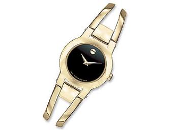 This stylish, contemporary ladies' Movado Amorosa gold-tone bangle watch has a black dial in a round case and is water resistant. It is sure to look gorgeous on any woman's wrist!