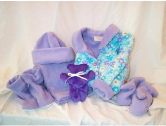 Package includes: flannel fleece lined jacket and fleece pants, socks, slippers (with grippy soles), hat, and double layer mittens. Plus a little bear friend! All clothes can be made to size 1T-4T with special alterations for the smaller or larger tike.