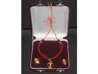 Beautiful jewelry set of Indian craftsmanship: choker style 22k gold heart-shaped pendant suspended from multiple strands of red semi-precious beads with matching 22k gold heart-shaped earrings.