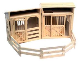 This spacious Folding Horse Stable from Lights, Camera, InteractionTM is compatible with all standard toy horses, and is the perfect accessory to hours of glorious make-believe play. 100% wood stable is built in the classic all-American barn style, and features 7 working doors, including sliding doors as well as top/bottom door combinations for all your horse-training needs. Also includes a hayloft with ladder, and fence segments to set up an attached corral.