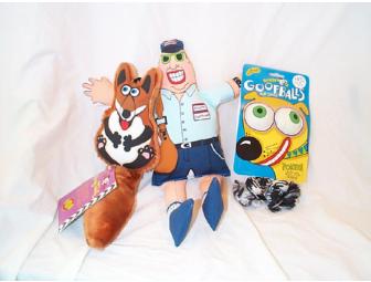 This Postal #1 collection of dog friendly items include: Floppability "Postal Plaything" Dog Toy, a Merry Tails Doggy Tails squeaky toy and a set of Doggy Hoots Goof Balls.