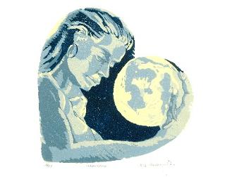 Michael Roosevelt created this piece just for HeART using our heart template. This is a four-color wood block print using the reduction method. This means that each color was printed from the same block – the first color was yellow; then more of the block was cut away and the next color printed until the image was complete.