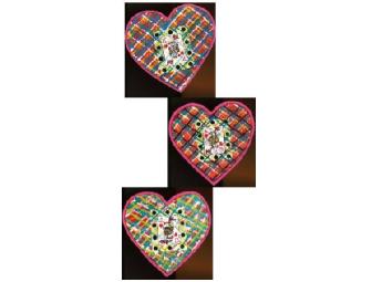 This item includes 3 hearts; each made by a member of the Binsen-Wilson family. Please note, the black circles on the hearts are actually mirrors that reflected in black in the photograph.