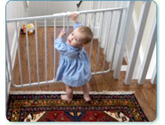 Protect your most valuable possession with a white Cardinal "Stairway Special" baby gate and one set of gate mounts, donated by Babyguard for Babyproofing in Mclean, Virginia. The gate fits openings between 27" and 42.5" and features a two-point latch system, double gravity latch locks and opens either direction.