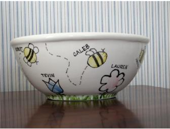 This Ceramic Bowl was made with lots of love from Mrs. Villa's First and Second Grade Class. It features the fingerprints of each child that we used to make bumblebees and flowers to decorate the outside of the bowl. Every bumblebee and flower is labelled with each child's name. The bumblebees are the Second Grade Class, and the Flowers are the First Grade Class.