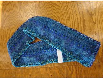 Each stitch of this beautiful 6" x 46" hand-crocheted scarf includes a prayer for the wearer. Gorgeous shades of blue, speciality yarns, fabric and ribbon are worked thru the scarf. It is a wearable work of art and love.