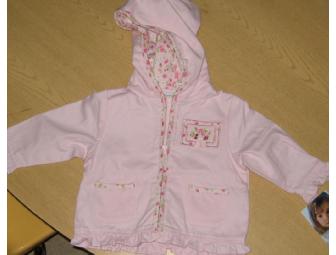 From Vitamins Kids she'll look adorable in this pink twill zip jacket (unlined) with hood strawberry print trim and two small front pockets. A perfect Spring jacket! 100% cotton. Size 12 mos.