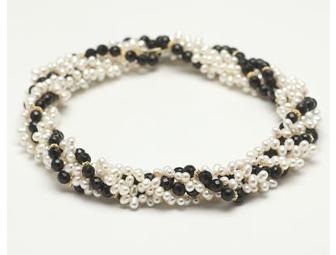 Three interchangeable loops of freshwater pearls and semi-precious stones twisted together into a necklace.