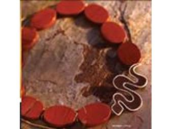 This piece is gorgeous! This Beth Beaudoin original necklace is made of red jasper with ebony wood dividers and has a sterling silver snake clasp with a stingray.