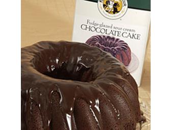 This moist, rich bundt cake, topped with a fudge glaze, is made with select ingredients, including three kinds of chocolate, sweet cream buttermilk, sour cream, and all-natural flavors. Yum!