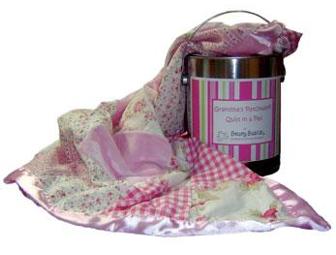This adorable assortment will make you or another mom-to-be very happy. It contains a beautiful green diaper bag, grandma's patchwork quilt in a pail, and blue polka dot thank you notes.