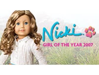 The 2007 Girl of the Year - Nicki! Nicki Fleming is ten years old and a natural with animals. She is also in the midst of training Sprocket, the pup, as a service dog. Your basket includes an eighteen inch Nicki doll, paperback book, ranch outfit, duffle bag, a summer shorts outfit, straw hat, Sprocket the Pup, service dog vest, training log and puppy. treats.