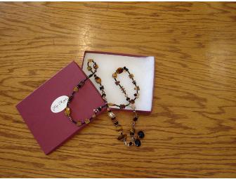 This 39" lariat necklace represents an exquisite use of Swarovski crystals beads, semi-precious geometric tiger-eye stone, murano glass, sterling-silver spacers and faceted black onyx beads.