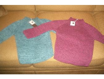 Tea Collection has donated two absolutely exquisite children's Nepali sweaters. The mock neck sweater is a signature Tea piece. The 2x2 rib marled knit sweater is made of the finest pima cotton. Its soft feel and high quality fabric will make it a beautiful addition to any child's wardrobe. Both sweaters are a size 4, just perfect for your preschooler. The first is a fuscia pink and brown knit, and the second teal and light blue knit.