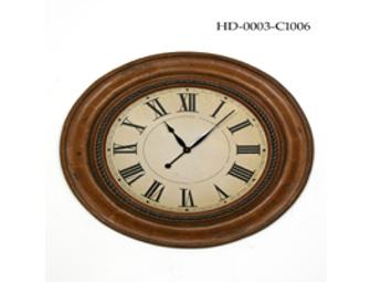 This classic distressed wall clock has roman numerals. A roped inside trim frames this old world timepiece. Dimensions are 36" round.
