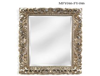 Fully beveled glass is surrounded by an elegant frame that is intricately scrolled with fillets and leaves in a distressed silver finish. Dimensions are 23" X 32" with a 6" molding.