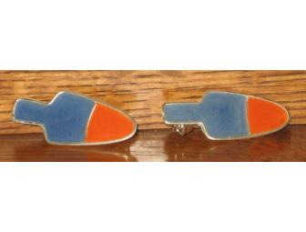 Arrowhead-shaped, sterling silver earrings with a simple enamel design in sky blue and orange, handmade by Maine artist Barbara Beebe.