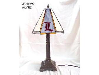 Executive quality Louisville stained glass table lamp by Janco Studio. Lamp measures approximately 25" high with a metal base. Shade measures 10"x10"x10".