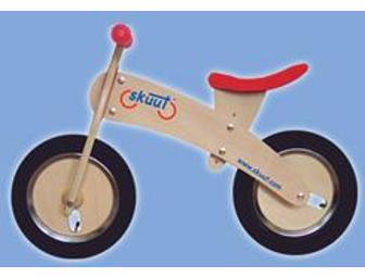 The Skuut is a wooden bike for children ages 2 - 5. It has no pedals and no training wheels. Children kick off the ground as if running, thus pushing or "skuut-ing" themselves and the bike forward. The Skuut is perfect for learning balance, steering, coordination and independence. Having mastered balance on the Skuut, the transition to a traditional two wheeler bike is easy.