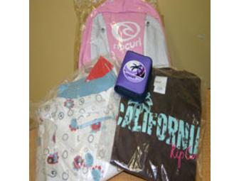 These items are perfect for your little surfer girl. This package includes a wallett, shirt, PJ bottoms, and backpack. Size small.