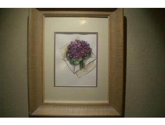 A beautiful and simple watercolor painting by listed California artist Nancy Martin (1906-2000), "A Bunch of Violets" would be a wonderful addition to a sunroom or breakfast room. This framed painting is 17" wide by 21" tall (with frame) and is matted in a soft textured frame with offwhite matting and plum colored trim. Nancy Martin was born in London, England and after a short time in Canada moved to San Francisco where she became a charter member of the Society of Western Artists. Her work has been shown in the deYoung Museum and she is noted for her rich botanical paintings.