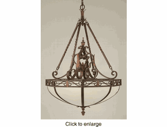 This is a lovely Murray Feiss Lighting Normandie Court Chandelier in Palladio. It measures 46.5 H x 30 D and requires four 100-watt medium base socket bulbs. It features a cream glass snow shade and is 44 pounds. The Normandie Court Collection was inspired by the grand gates that cloister the 18th century European homes. Multiple wrought iron curls are accented by formed steel leaves which are hand painted in Firenze Gold and strike a bold contast to the warm Palladio finish.