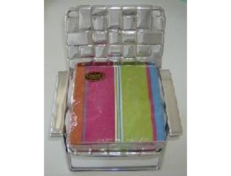 Cast aluminum beach chair napkin holder with a set of cocktail napkins by Gaspari. The chair is 6" high.