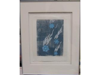 This is a three-color block print by Samuel Leshnick. Samuel Leshnick trained at the Art Center College of Design in Pasadena and is a designer and illustrator in San Francisco. This is a signed three-color block print with cream matting and silver frame completed in 2007 and is untitled. 11'' x 14''. You can see more of his work at www.samuelleshnickdesign.com.
