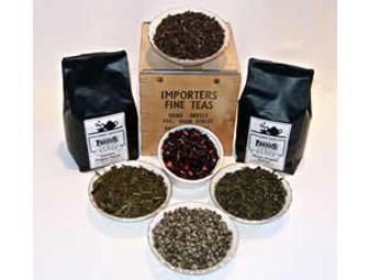 From Freed's Coffee & Tea. An infuser teapot in the color Juniper from huesnbrews, along with 10 1/4 lb. tins of specialty teas in gold tins.