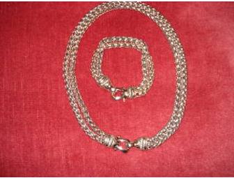 This set of faux David Yurman jewelry includes a 16" double rope necklace and a 7 1/2" bracelet in silvertone, with magnetic clasps.