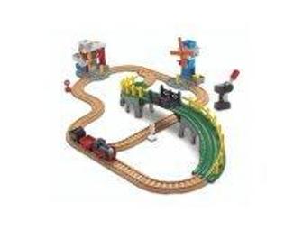 - Set includes 30 pieces such as mountain ramps with a bridge, diesel-style engine with 2 attached cars, cargo pieces, signs and 15 durable track pieces that easily snap together for many configurations