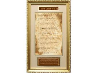 Ever wonder where the rules of golf came from? Look no further than this plaque which recounts the 13 Rules of Golf. Back in 1744, to ensure that all players participating in the first recorded golf competition at Leith Links were abiding by the same rules, the Gentleman Golfers of Leith, soon to become the Honourable Company of Edinburgh Golfers, drafted and posted the Original 13 Rules of Golf. Golf, like every sport, evolved over the years, and so did the rules, but most of the old rules still apply. Among the rules: You must Tee your Ball within a club length of the hole; You are not to change the Ball which you strike off the Tee; You are not to remove Stones, Bones, or any Break club for the sake of playing your Ball, Except upon the fair green, and that only within a Club length of your Ball. The original 13 rules of golf is custom framed in a gold leaf frame with double matting. The approximate size is 20" x 12".