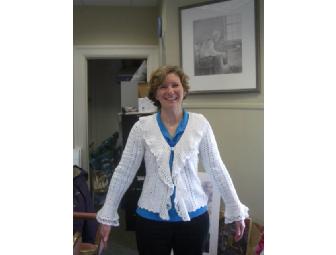 Delicately crocheted white cardigan by One Girl Who. Ruffled at the neckline and at the cuffs for a lovely romantic look. Size: small