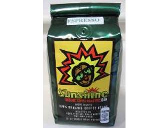 Organic Fairly Traded Fresh Roasted Coffee from Sunshine Organic Coffee Roasters of Forestville. Includes: 12oz Bag French Roast 12oz Bag Italian Roast 12oz Bag Light Roast 12oz Bag Espresso 12oz Bag Swiss Water Decaf Whole Bean Coffee