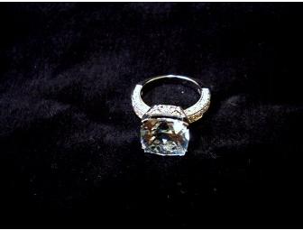 One ladies 18k white gold and 6.48 ct aquamarine and diamond ring, set with 1ct of pave diamonds.