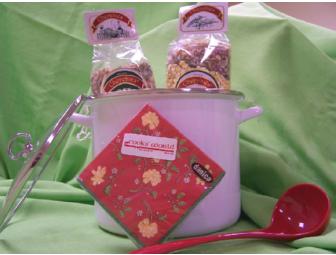 8 qt. Reston Lloyd (Calypso Basics) stock pot, white. Includes two soup mixes (corn chowder and Italian wedding), ladle and napkins.