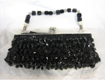 This black frame evening bag is the perfect accessory for a night on the town. Complete with jeweled clasp and beaded strap, it will complement any wardrobe with elegance.
