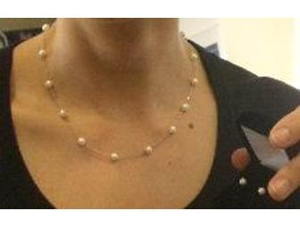 An 18" 14kt white gold pearl necklace, 5.0 mm white cultured pearl earrings with 14kt gold posts and a gift certificate for $25 at Trillium.