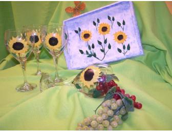 4 wine goblets with handpainted serving tray. Sunflower motif.