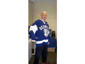 Mike Eruzione, Berwick Alumnus and captain of the gold medal winning 1980 U.S. Olympic Hockey Team, has signed this authentic Berwick Academy hockey jersey and a "Miracle" DVD. As an added feature, this item comes encased in a glass front, hardwood, 30" x 30" handmade case from Berwick Varsity Hockey Coach Andy Lathrop.
