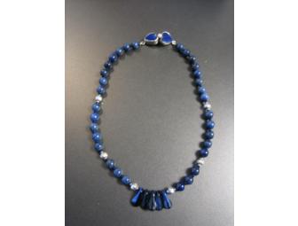 This beautiful 16 inch necklace is handcrafted with beads of silver and Lapis Lazuli, one of the hottest stones in accessories today. Complete with teardrop beads and heart-shaped clasp, this lovely piece of jewelry is perfect for an evening out or a day in town.
