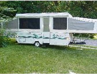 Jayco model 1208 Tent Trailer for a week. Sleeps up to 8 people. Sides fold out with king bed on one side and double on the other. Propane heater. Electric and/or propane refrigerator. Propane cooking stove for indoor or outdoor use. Eating area (folds out to bed at night). Trailer is a 1993 with newer canvas and screens -- good condition. Terms of use: One week use of tent trailer (+ or -- a few days if desired). Timing -- to be arranged with the Veits. Requires 2" ball trailer hitch. Travel length is 16' 10". Weight is 1,625 lbs. Requires a 24' long campsite. If necessary, owner willing to do a vehicle swap for the timeframe so you can use his vehicle to tow the trailer. Value approx $300.00.