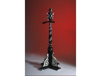 A 4' high black coat tree is decorated with white whimsical notes and matching hangers. This free-standing child-size coat rack was designed, built and painted by Kristen Wiese-Adelman.