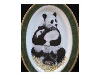Panda Bear and Cub on Porcelain Malachite Platter Artist: Karen Grubaugh of Art on Porcelain This piece of original porcelain art was painted with a process first used in China more than 2,000 years ago. The artist meticulously painted the design several times and fired it to about 1400 degrees. This piece can be used as a serving platter and stored by hanging it on the wall as a work of art. It is the artist's hope that this will become your family's heirloom. [Dishwasher safe]