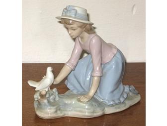 Enjoy a peaceful moment as you gaze at this charming vignette in pink and blue - a young girl in a be-ribboned straw hat kneels down to touch a dove. The springtime of Life?