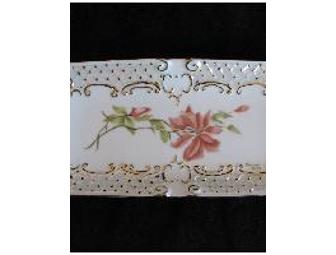Rose on Small Porcelain Tray Artist: Karen Grubaugh of Art on Porcelain Original hand painted piece with Mother of Pearl and Gold finish. This piece of original porcelain art was painted with a process first used in China more than 2,000 years ago. The artist meticulously painted the design several times and fired it to about 1400 degrees. It is the artist's hope that this will become your family's heirloom.