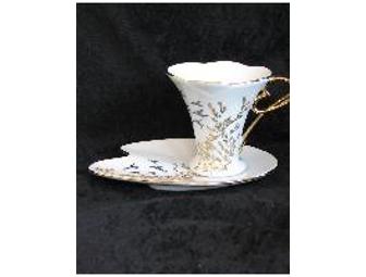 Delicate Porcelain Cup and Saucer in Raised Gold Style Artist: Karen Grubaugh of Art on Porcelain This piece of original art showcases a raised gold technique with gold pen work lines and black pen work birds. The design of the cup and saucer is available for the first time. It is the artist's hope that this will become your family's heirloom. [Dishwasher safe]