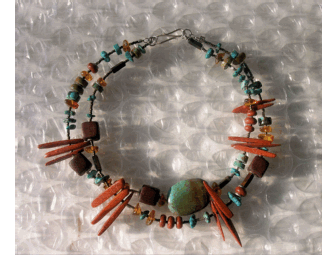Made of turquoise, amber, sponge coral, silver and wood. This beautiful 18" necklace has a sterling silver handmade clasp. It was inspired by Mount Desert Island's autumn colors.