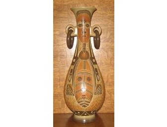 Large African masks (or shields with faces) decorate this tall, amphora-shaped vase with twin handles. Don't fight over this one— its almost-twin (with birds) is Item #377. Or buy both yourself!